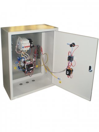 Защита при работе электродвигателя осуществляется с помощью автоматического выключателя с максимальным электромагнитным и тепловым расцепителями и тепловым реле электромеханического типа. Автоматический выключатель и тепловое реле по заказу могут быть заменены на автомат защиты двигателя.